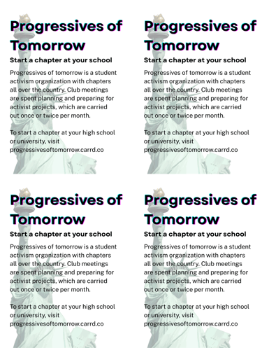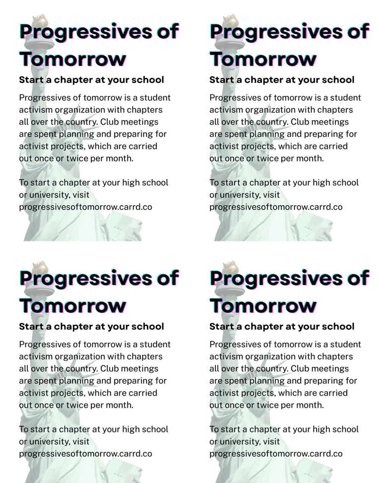 Progressives of Tomorrow is a national student activist organization with chapters in high schools, colleges and universities all over the country. Pass these flyers out to inform others about the organization.